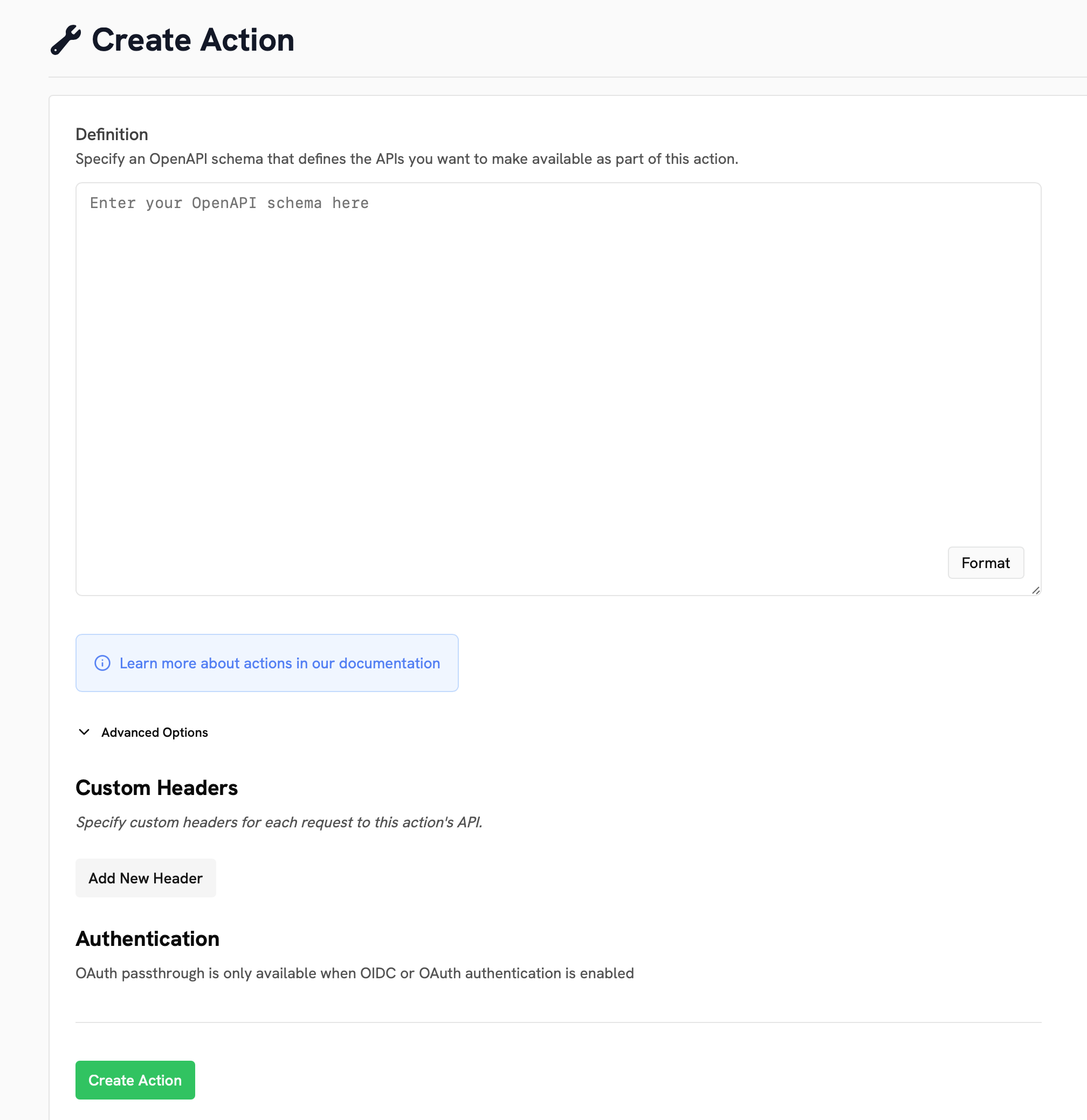 Click From OpenAPI schema under Create Action . Paste your OpenAPI spec and configure any required authentication or headers.