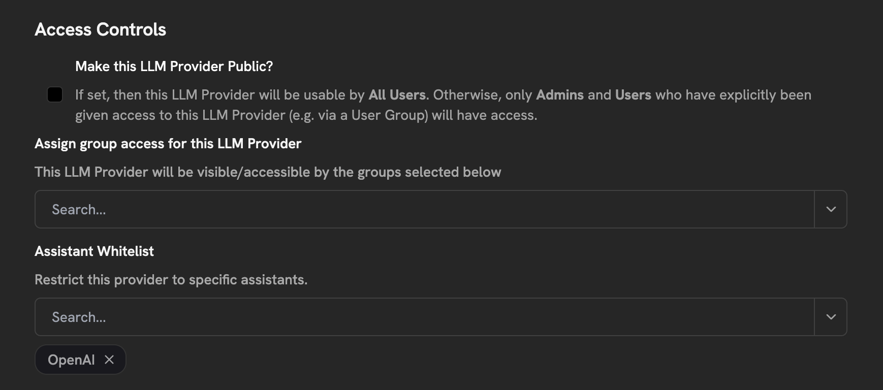 Control who can use specific LLM providers by restricting access to specific user groups.How it works: