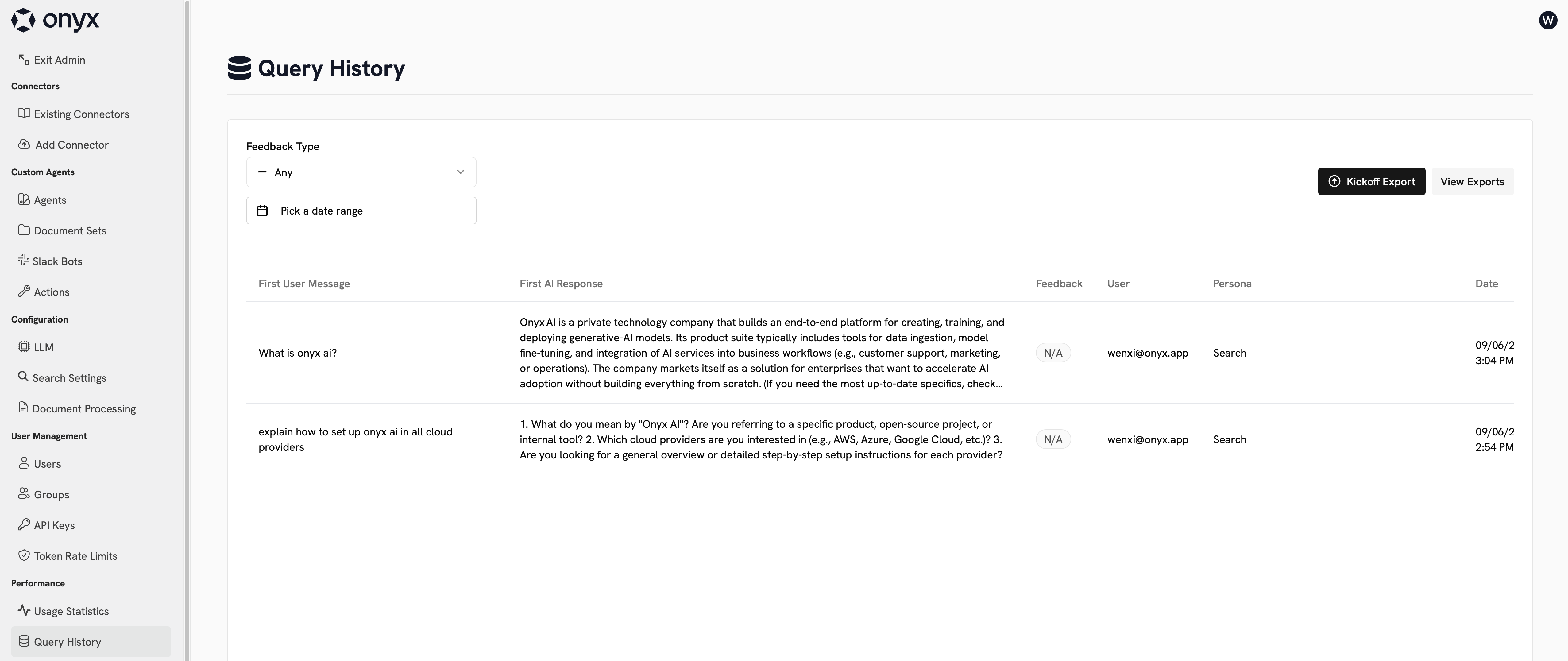You can export your query history to a CSV file. This export can be time consuming depending on the size of your query history.Usage Statistics