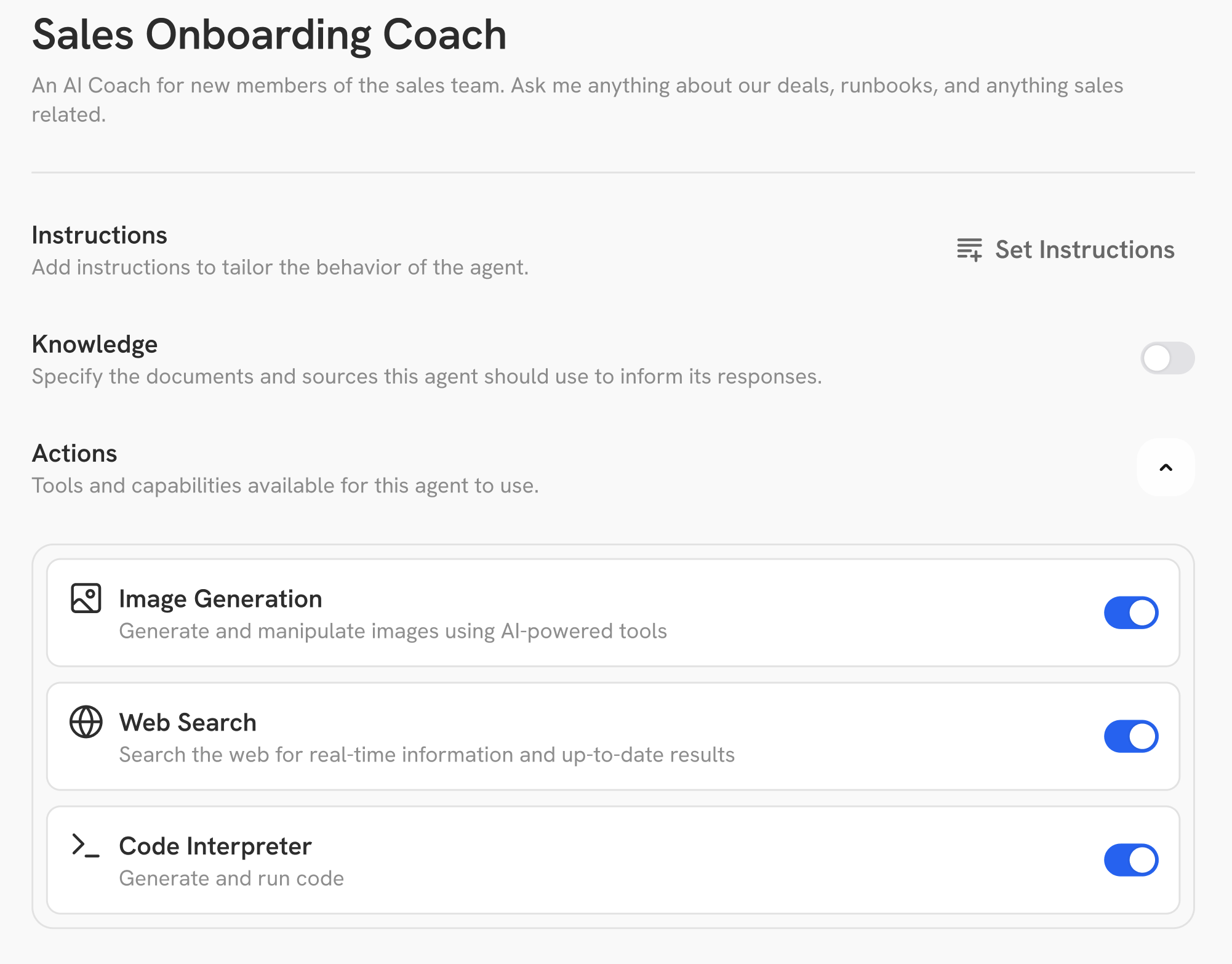 Agents are a combination of user specified instructions, knowledge, and Actions.