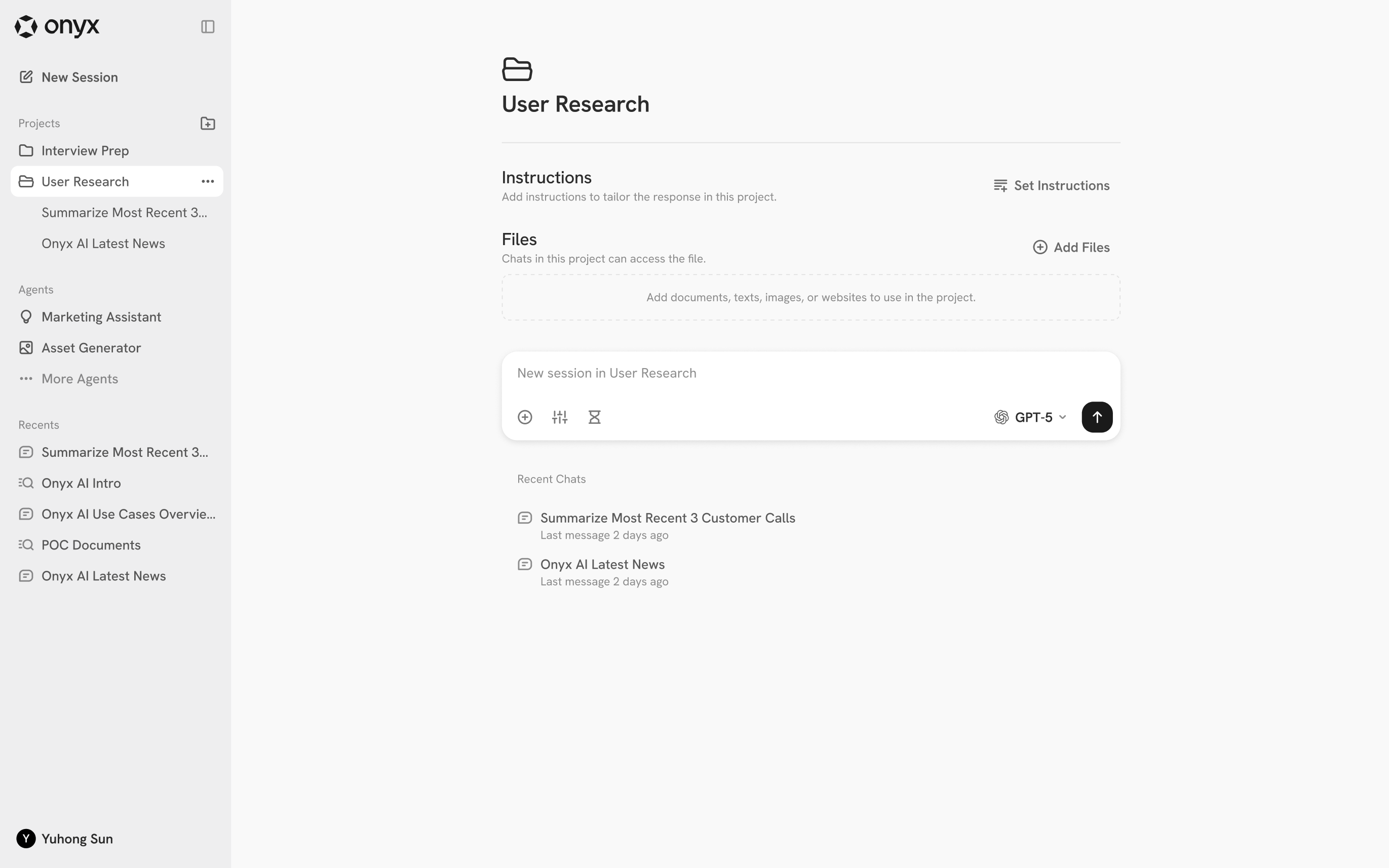 The left sidebar contains:New Sessionbutton to clear the history and start a new Chat or Search session.Projectsto help users organize chats and reuse different sets of documents. See section below for more info.Agentssection to start a new session with yours or your team’s custom Agents.Sessionssection containing a list of the most recent conversations.